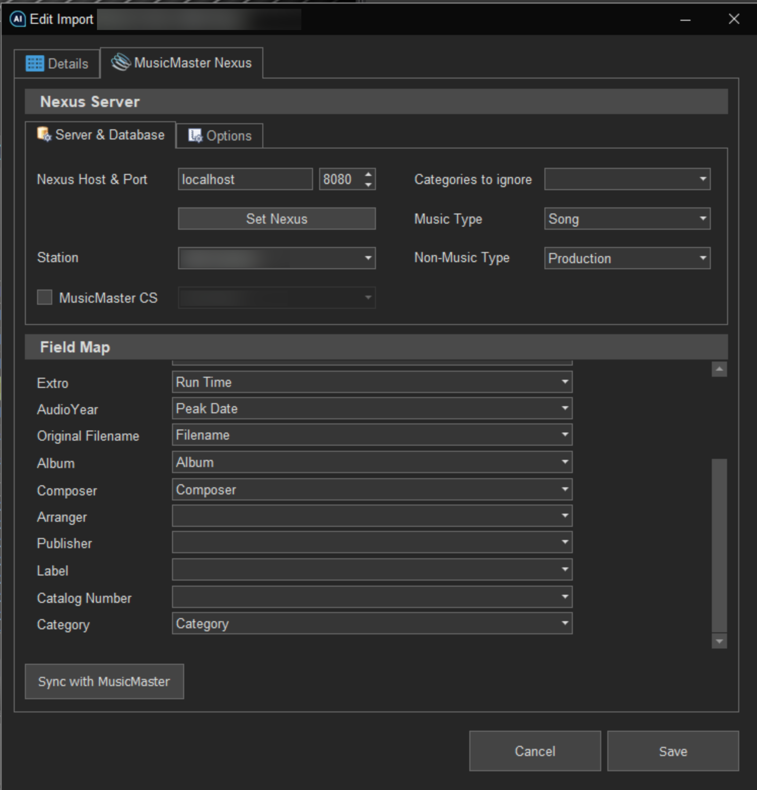From there, you can tell PlayoutONE which server and port Nexus uses, any categories to ignore, and which fields to map:
