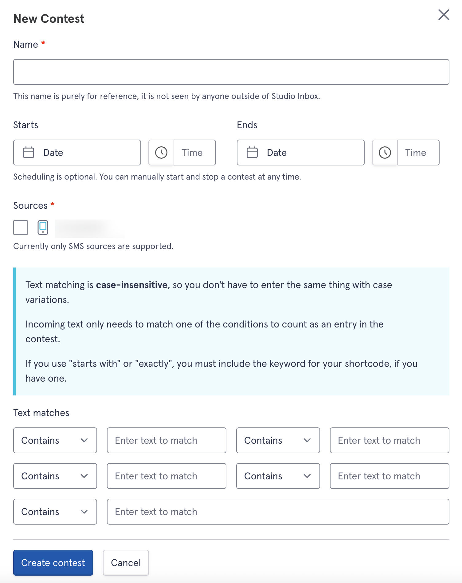 You can then create a new contest or edit an existing one, giving it a name, start/end times, which SMS source to monitor for entries, and the text a message should contain to be a potential winner: