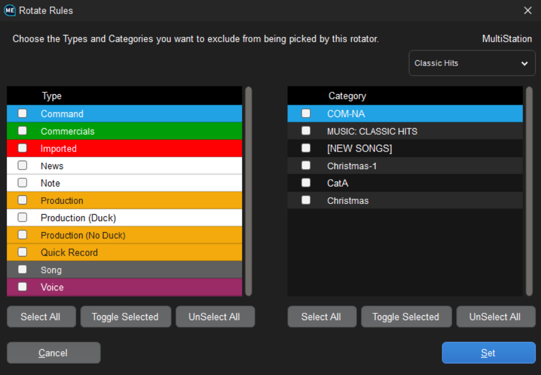 PlayoutONE rotators can have rules applied to allow only certain item types or categories to resolve on a certain station.