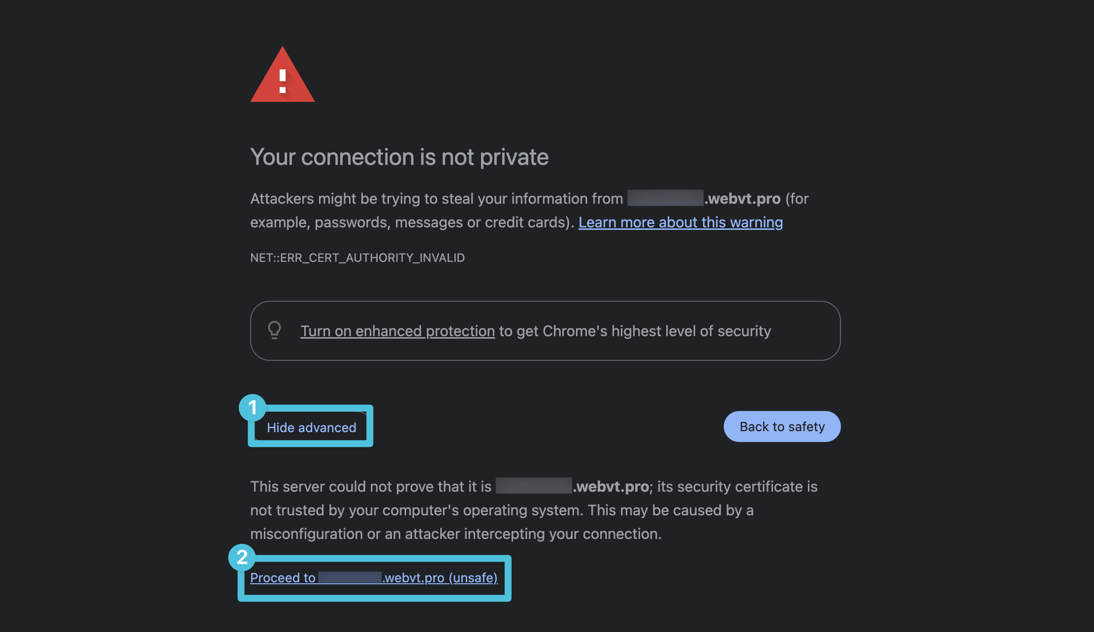 If you are using a WebVT.pro domain or your own domain without setting up an SSL certificate on your server, you may see a warning that your connection is not private: